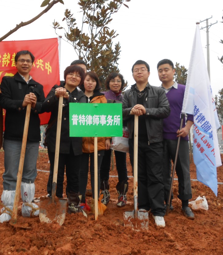 植树园很大,但爱心植树的人非常多,现场已是热火朝天。我们在指引下迅速找到了湖南普特律师事务所的植树区并开始植树。大家分工明确,有辛勤挥动着锄头挖坑的、有用尽全力用铲子铲土的、还有在填好的坑上夯土的,总之大家情绪高涨,各自使出了十八般武艺。不过植树并不像想象的那般容易,尤其是挖坑,是门技术活,没有体力没有经验还真不做不来,这个活主要让男律师在做,而女律师主要负责填土工作。就这样,大家汗流浃背地干了两个多小时才把两棵树植好,任务总算圆满完成。